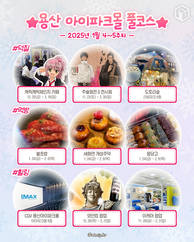 아이파크몰에서는 『캐릭캐릭체인지』 테마 카페, 『주술회전 0』 전시회 같은 애니메이션 팬들을 위한 특별 공간부터, 설 선물로 좋은 K-디저트 개성주악, 바삭한 불초밥, 달콤한 슬랩파이 같은 먹거리 팝업까지 즐길 수 있습니다. 여기에 500가지 와인을 한자리에서 만날 수 있는 와인킹 윈터랜드와 세계적인 아이맥스 상영관을 보유한 CGV 용산까지 준비되어 있어 하루 종일 알차게 보낼 수 있답니다.