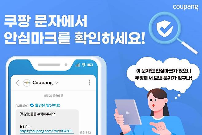 이날부터 쿠팡 공식 고객센터(1577-7011)가 발송하는 문자메시지에는 쿠팡 로고 이미지와 함께 ‘안심 마크’가 표시될 전망이다. 해당 안심 마크는 체크 표시가 있는 방패 심볼 마크와 ‘확인된 발신 번호’라는 문구로, 문자메시지 상단에 표시되며 발신자가 쿠팡인지 아닌지 구별할 수 있도록 만들어졌다.