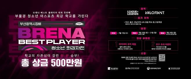부산시와 부산정보산업진흥원이 오는 7월 28일 부산이스포츠경기장(이하 브레나)에서 부산광역시장배 브레나 베스트 플레이어 청소년 대회를 개최한다고 2일 밝혔다.