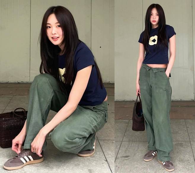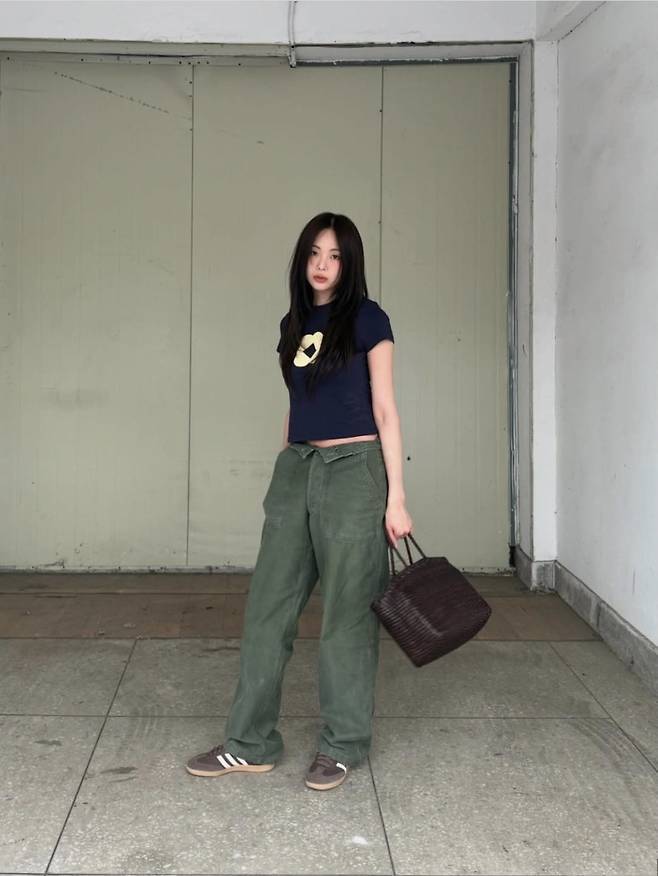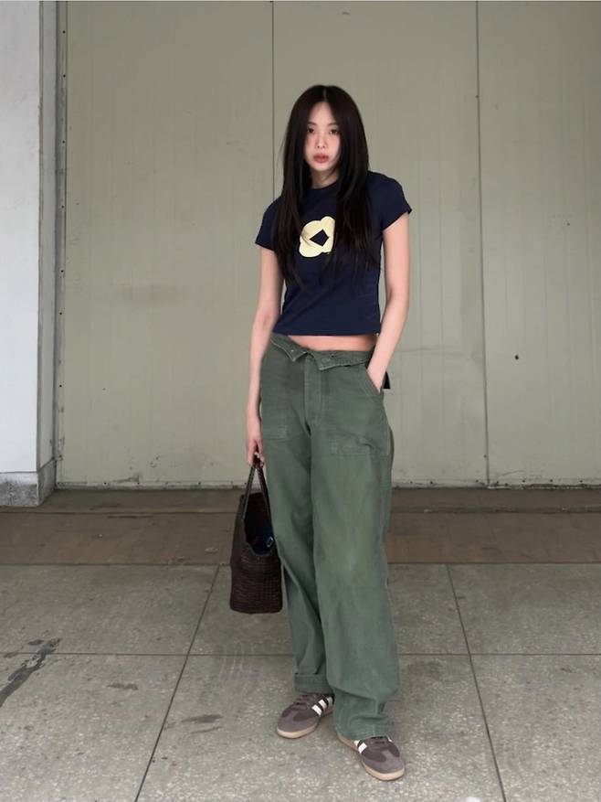 금새록은 짙은 남색의 크롭 티셔츠에 넉넉한 핏의 카키 팬츠를 매치해 자유로운 감성을 표현했습니다.