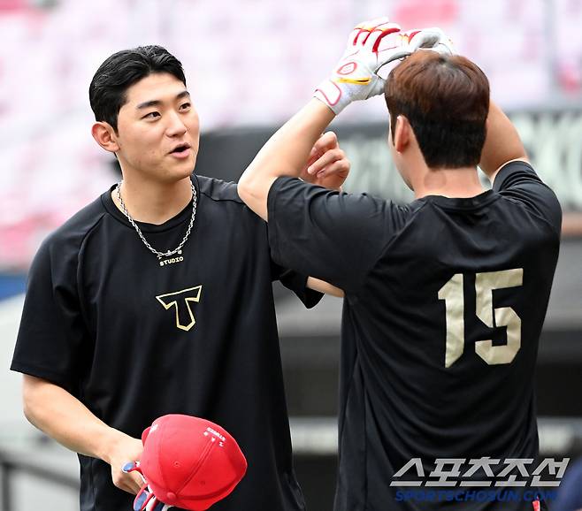 15일 광주KIA챔피언스필드에서 열린 롯데와 KIA의 경기, 타격훈련을 하던 김도영과 박정우가 이야기를 나누고 있다. 광주=허상욱 기자wook@sportschosun.com/2025.05.15/