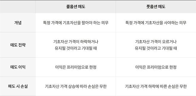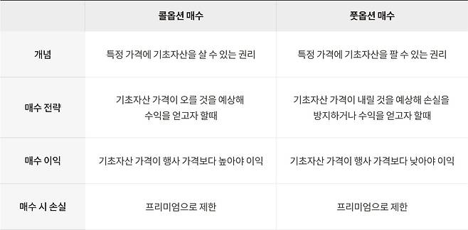 콜옵션은 미리 정한 가격에 기초자산을 살 수 있는 권리를 뜻하고, 풋옵션은 미리 정한 가격에 팔 수 있는 권리를 뜻해요.