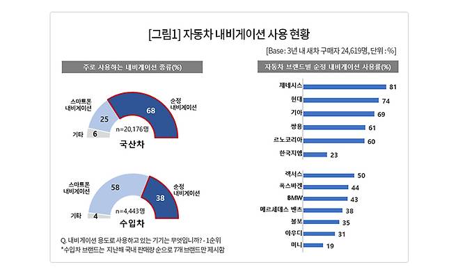 12일 소비자리서치 전문기관 컨슈머인사이트가 시행한 연례 자동차 기획조사(매년 7월 약 10만명 대상) 결과에 따르면 자동차 보유자가 어떤 내비게이션을 주로 사용하는지는 국산차와 수입차별로 큰 차이를 보였다. 국산차의 순정 내비게이션 활용도는 68%였던 반면, 수입차 보유자는 38%에 그쳤다. 먼저 국산차는 제네시스가 81%로 가장 높았다. 이어 현대자동차 74%, 기아 69% 순으로, 현대차그룹 3개 브랜드가 앞섰다. 쌍용자동차와 르노코리아자동차는 각각 61%, 60%로 그 뒤를 따랐다. 한국지엠은 23%로, 국산은 물론, 일부 수입차 브랜드보다도 낮았다.