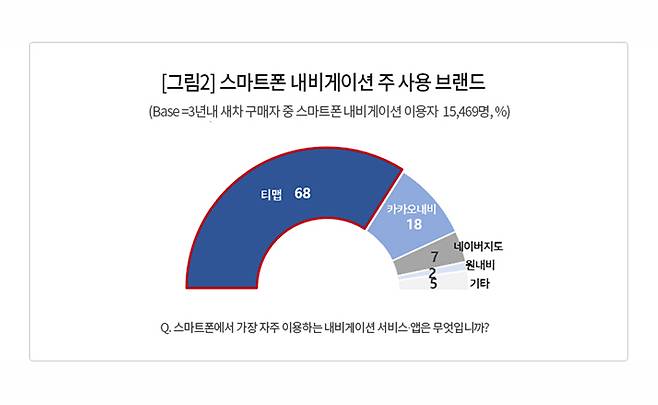 수입차 순정 내비게이션은 지도, 정보량, 반응속도 등 기능 측면에서 열세인 데다 업데이트도 더디고 불편하다는 게 일반적인 소비자 평가다. 그 대안으로 최근 일부 국산·수입차 브랜드는 티맵 기반의 인포테인먼트 시스템을 내장형 내비게이션으로 채택하고 있다. 이번 조사 결과 스마트폰 내비게이션 가운데 이용자가 가장 자주 사용하는 앱은 티맵이 68%로 압도적이었다. 그 뒤로 카카오내비 18%, 네이버지도 내비게이션 7%, 원내비 2% 순이었다.