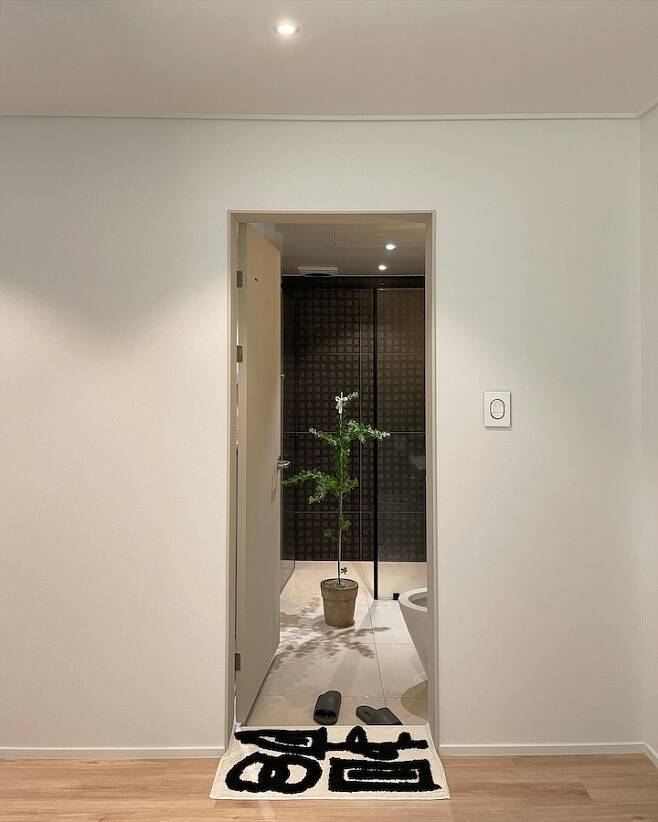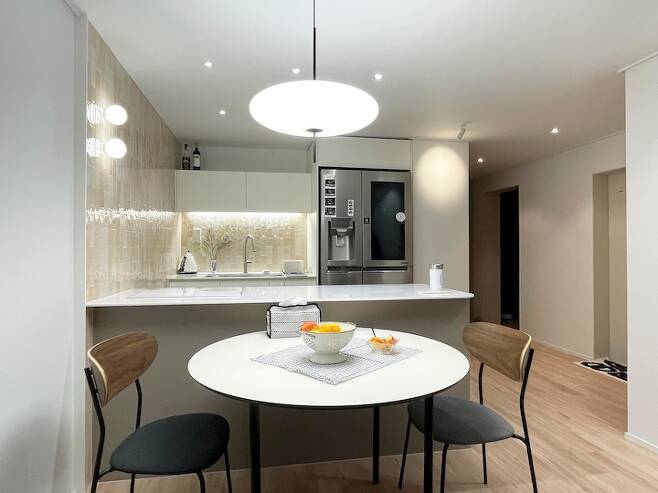 벽 마감재는 전체 LX지인 벽지로 시공했고 회벽 느낌이 나는 재질로 다운라이트가 은은히 비출 때 고급스러움이 배가 됩니다. 거실과 복도 등은 IOT 스위치를 설치했는데 다른 방에 있거나 집 밖에 있어도 어플로 켜고 끌 수 있어서 참 편리해요.