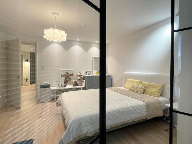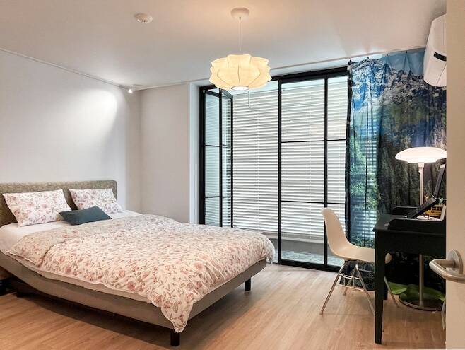 침실은 블랙 프레임의 초슬림 폴딩 도어로 시공했어요. 일반적으로 세로선만 있는 프레임이지만 가로 철제 라인을 추가해 큰 격자무늬 창으로 보이도록 연출했더니 침실은 거실과는 또 다른 무드가 만들어졌어요. 포인트 벽 조명 위치에 맞는 액자도 걸 계획이에요. 아직 미완성 상태이지만 지금의 깨끗한 느낌도 좋네요.