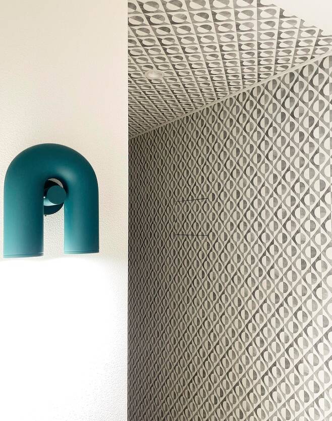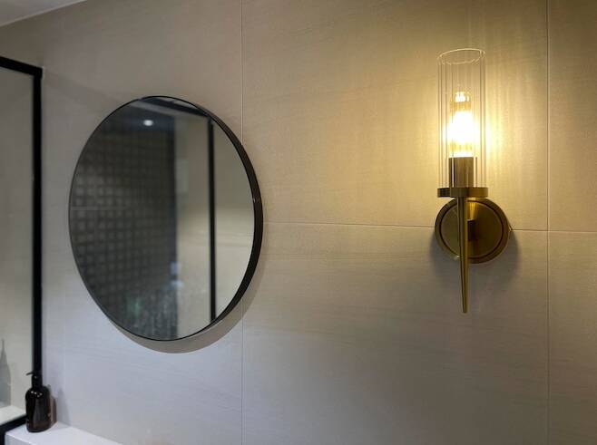동글동글한 벽 등이 유광 타일과 만나서 너무 예쁘죠. 조명 고를 때도 사이즈가 다양해 고민을 많이 했는데 완성하고 보니 귀여운 포인트가 되었어요.
