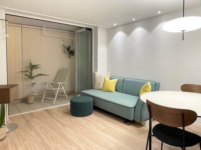 발코니에 조립 마루를 깔아 거실과 이어진 듯 넓은 공간으로 활용하고 있습니다. 폴딩도어의 강화유리 사이에는 고무패킹과 상하단 모두 문틈 막이가 있어 닫았을 때에 바람 차단도 확실하답니다.