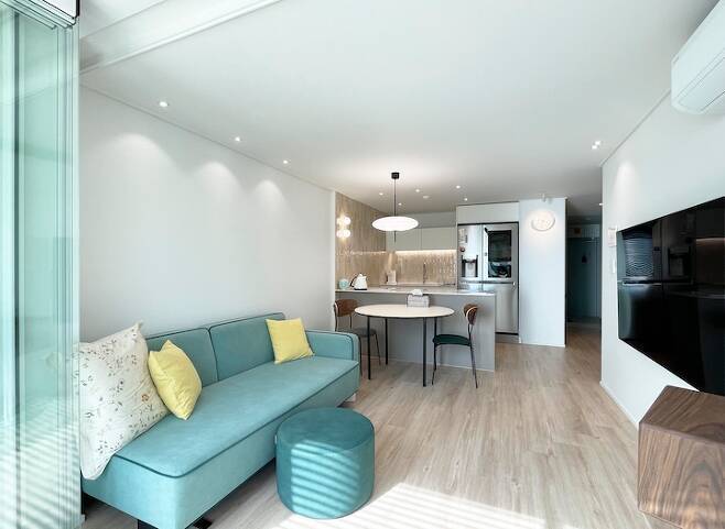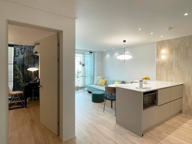 발코니 쪽에서 바라본 거실과 주방 한쪽.