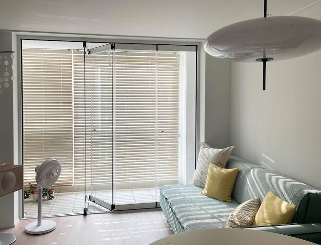 우리 집의 포인트로 꼭 설치하고 싶었던 폴딩도어! 거실 쪽은 개방성도 있도록 글라스 폴딩도어로 설치해 일반 샷시 보다 훨씬 확장감이 느껴져요.