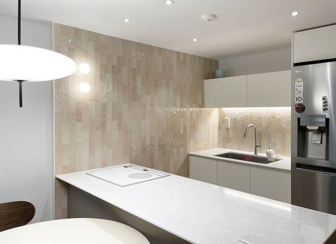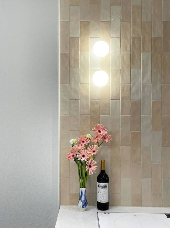 한 동안 주방 벽면은 무광의 600각 이상의 큰 타일을 붙이는 게 유행이었는데 자료를 많이 찾다 보니 조금은 색다른 시도를 해보고 싶더라고요. 윤현상재에서 이 타일을 발견했을 때 운명이다 싶었어요! 베이지 톤온톤으로 랜덤 컬러에 표면도 불규칙한 매력이 빈티지하면서도 우아한 느낌을 주네요.