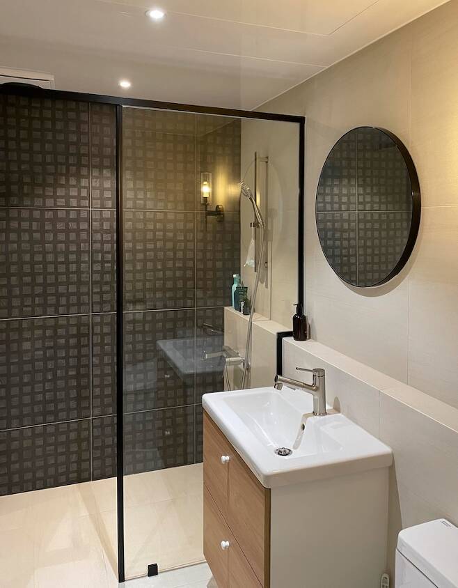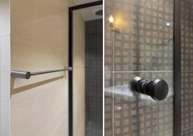 코너 칼각 타일과 심플한 수건걸이가 참 딱 떨어집니다. 그리고 샤워 부스 시공을 의뢰하면 모두 똑같이 달리는 타월 걸이 가로 손잡이 아시죠? 뭔가 주르륵 걸쳐놓게 되는... 용납할 수 없어요... 제작 전 미리 말씀드리고 심플한 블랙 무광 손잡이를 따로 구매해 달았습니다. 뿌듯 :)
