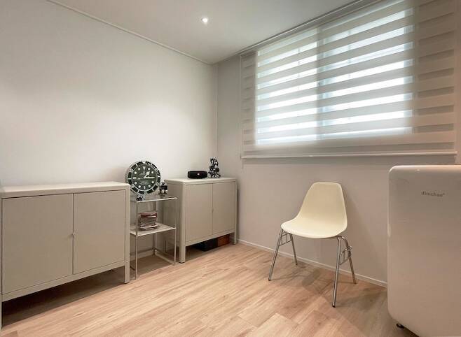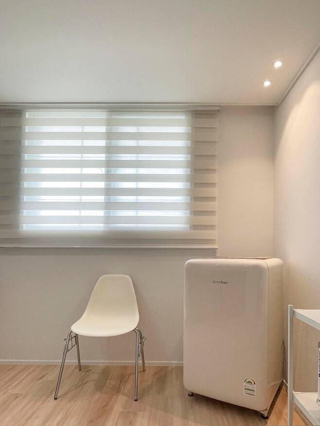김치 없이 밥 못 먹는 저희 부부는 김치 냉장고가 꼭 필요했는데 주방의 구조상 둘 수가 없어서 고민하다가 '쁘띠 딤채' 크림 컬러를 구매해 이 방에 두었는데요. 꼭 가구처럼 너무 잘 어울리죠?