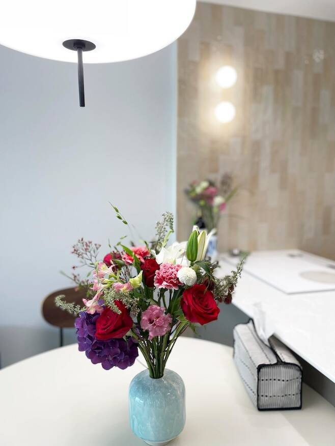 키친핏 냉장고가 아니라 조금 튀어나오지만 주방가구팀 실장님께서 1cm까지 꼼꼼하게 체크하셔서 최대한 싱크대 부분과 이질감이 없도록 가구 사이즈 조정을 해주셨어요. 상부장 부분도 여러 번의 수정 끝에 공간이 좀 더 넓어 보이도록 천장 상부는 띄우고 깔끔하게 2도어 장으로 설치했습니다. 좋아하는 아르호이 화병을 하나씩 모아 전시해두고 싶은 공간이에요 : )