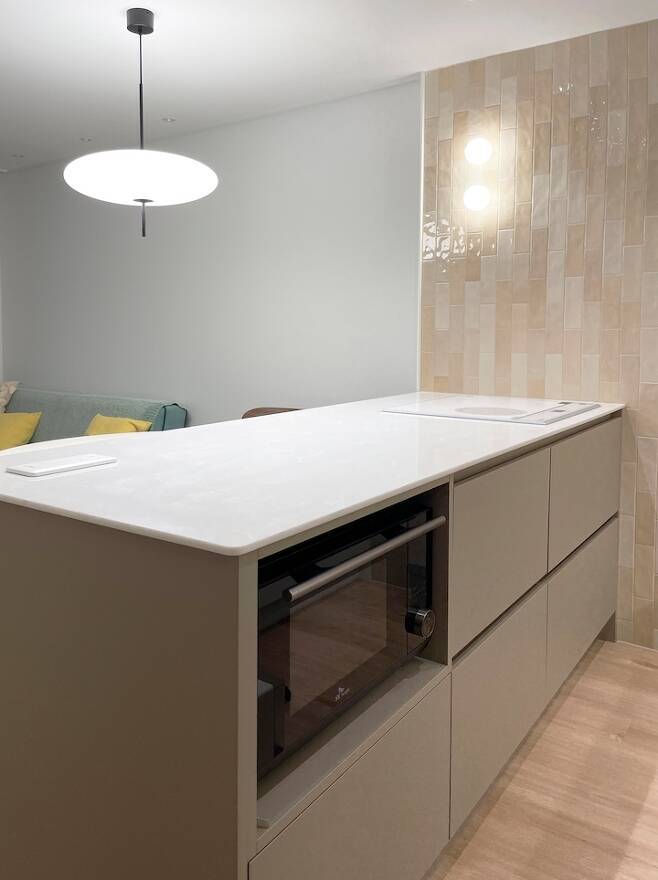 아일랜드는 서랍 5개와 올인원 오븐레인지가 들어가도록 제작했어요. 구조상 주방과 거실이 이어져 있어서 중간에 위치할 아일랜드 가구는 화이트 컬러로 하면 너무 이질감이 느껴질 것 같아 샌드베이지 컬러로 선택했는데 차분하게 마루와 잘 어우러져서 다행이에요.