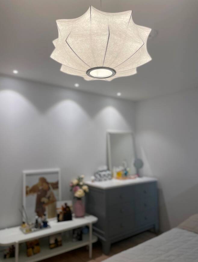 침실의 분위기를 한층 포근하게 만들어줄 펜던트 등을 달았어요.