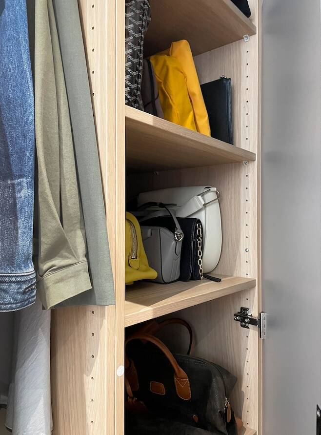 드레스 룸 너무 리얼한 것 같아 살짝 민망하네요^^; 이케아 팍스 장으로 채웠어요! 붙박이장 제작을 고려했지만 한번 설치하면 이동할 수도 없고 매일 열고 닫는 옷장 문은 경첩만 헐거워질뿐 필요없을 것 같았어요. 시스템 행거는 사용해봤지만 살다 보니 어수선해지는 느낌이 있더라고요.