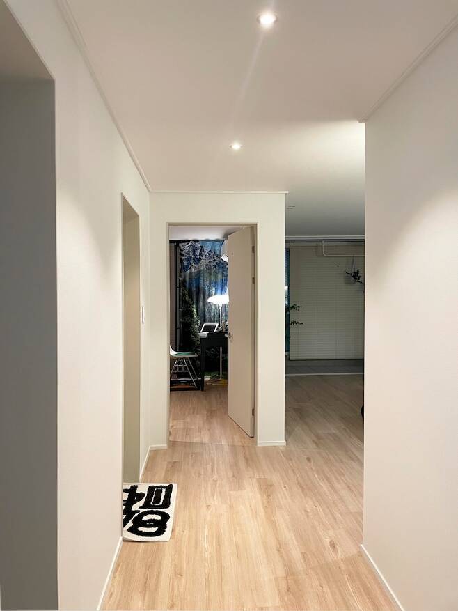 좋아하는 복도 뷰! 화이트 벽지, 베이지 문과 마루, 블랙 컬러 포인트가 잘 어울려요.