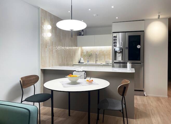 거실에서 바라본 주방의 모습이에요. 주방은 저희 집에서 가장 큰 변화가 일어난 공간이랍니다. 냉장고가 있는 자리에 기존에는 가스레인지가 있었고 짧은 ㄱ자 주방 구조였던 레이아웃에서 철거할 수 없는 기둥벽 옆에 냉장고를 두고 대면형 주방으로 새롭게 만들었어요!