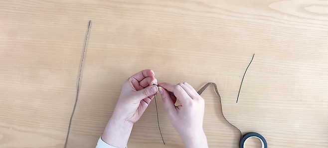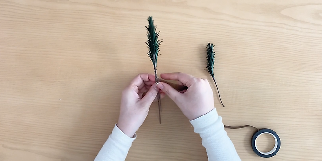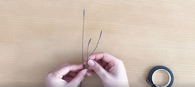● 길이가 다른 가지를 갈색 꽃 테이프로 서로 합쳐주세요. 가지 마지막 부분까지 테이프를 감아주고 가지와 가지가 만나는 마디 부분을 잘 펼쳐주세요.