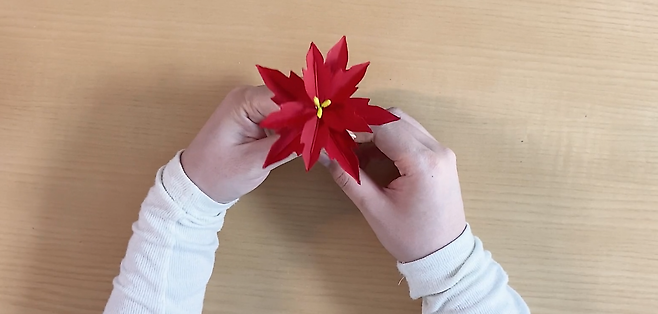 ● 큰 잎사귀부터 오각형을 이루도록 펼쳐주고, 잎사귀와 잎사귀 사이에 작은 잎사귀가 오도록 펼쳐줍니다. 마지막으로 노란 중심도 살짝 벌려주어 모양을 잡아줍니다.