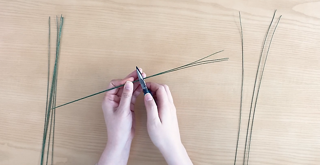 ● 먼저 26호 철사와 니퍼를 준비하고, 26호 철사를 1/4로 잘라주세요. 잘라준 철사 3개로 포인세티아의 중심을 만들어 줍니다.