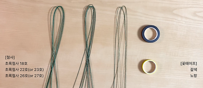 ● 리스 연결용 재료 : 초록 철사 - 18호, 22호(or 23호), 26호(or 27호), 꽃 테이프 - 갈색, 노랑