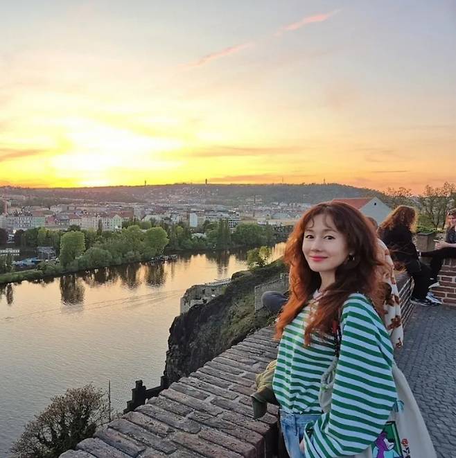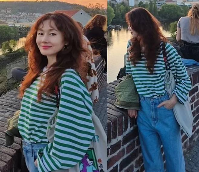 공개한 사진에서 김지수는 프라하의 저녁 노을을 배경으로 긴 웨이브 파마 헤어 스타일에 그린 컬러의 스트라이프 티셔츠와 데님 팬츠를 착용한 꾸안꾸 데일리룩으로 귀여운 동안 미모를 드러냈다.