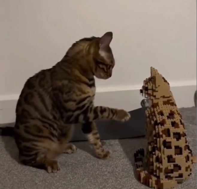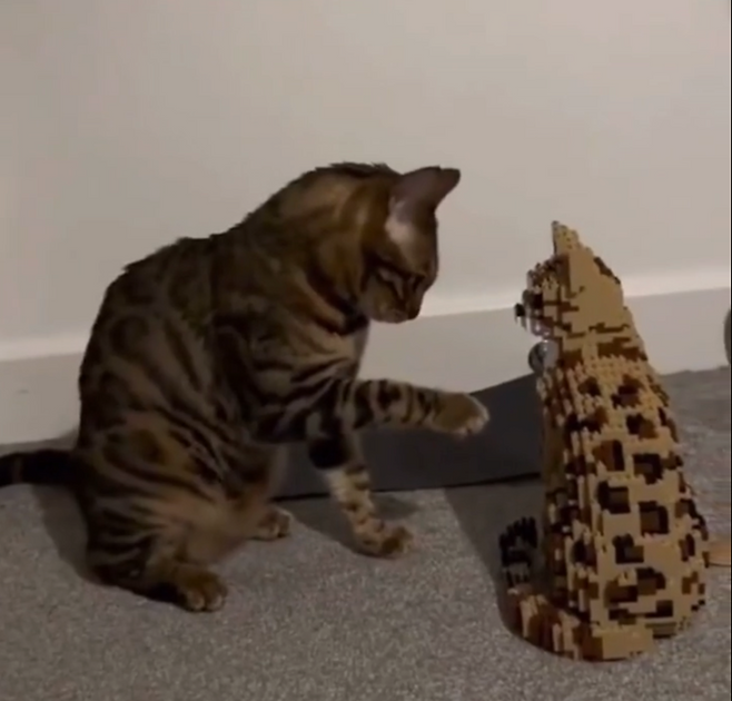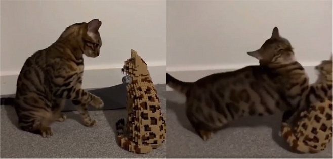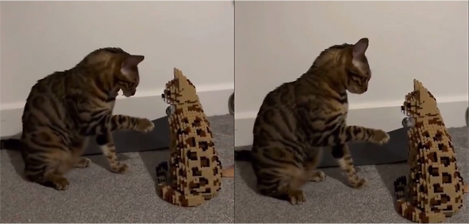 거실 한켠, 고양이 두 마리가 앉아 있습니다. 그런데 뭔가 이상하죠? 자세히 보면 한 마리는 부드러운 털을 갖고 있고, 다른 한 마리는 뚝뚝 끊기는 블록이.. 네, 바로 레고로 만든 고양이입니다. 진짜 고양이와 털 색깔, 무늬가 매우 비슷한데요. 레고 친구를 발견한 고양이는 악수를 청하듯 앞발을 들어 올립니다.