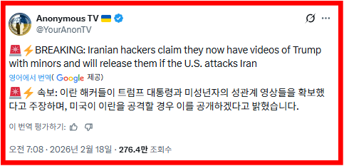 "이란 해커들이 트럼프와 미성년자가 등장하는 영상을 확보했으며, 미국이 이란을 공격할 경우 이를 공개하겠다."