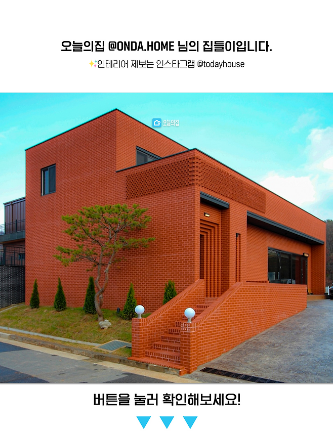 먼저 저희 집 외관의 모습이에요. 화이트 톤의 집도 좋지만, 막상 살아보니 이끼나 때 등 관리하거나 감당해야 할 일이 많더라고요. 그래서 저희는 적벽돌을 선택하였고 그 사이에는 핑크색 줄눈(메지)을 넣었어요. 통 샷시(새시)를 하고 싶었지만 깨질 위험을 고려해서 사이사이에 프레임을 넣어주어 내구성을 확보하면서도 통창의 분위기를 냈습니다.