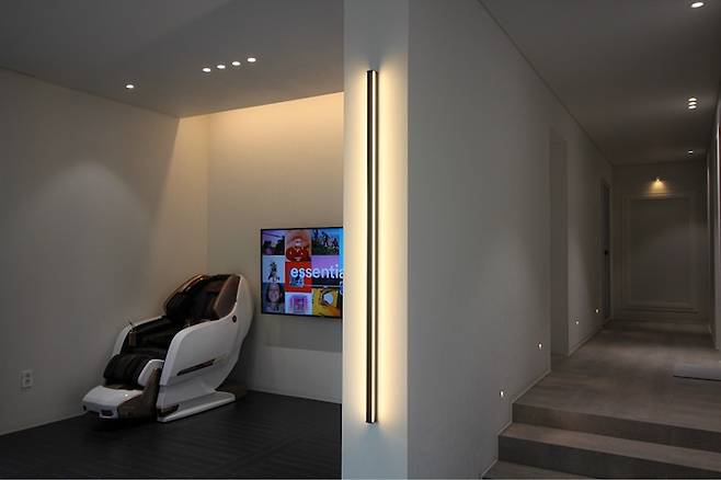그런 이유로 조리하면서 아이들도 확인하고 티비보면서 살림할 수 있는 구조를 만들었어요. 대면형 주방이라서 손님들과 대화도 자유롭고, 아이들과 소통도 가능하답니다. 그리고 저희 집에 오시는 손님 분들이 안마의자를 많이 사용하시는데요. 안마의자를 거실에서 주방 쪽으로 정면을 바라보게 배치하여 대화를 편하게 할 수 있도록 했어요.
