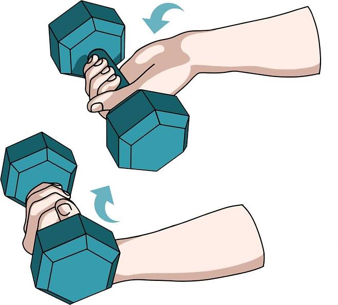 이 근육을 빠르게 성장시키려면 ‘해머 컬’이 정답이다. 덤벨을 잡을 때 손바닥이 서로 마주 보도록 하고, 팔꿈치를 고정한 채 덤벨을 들어 올린다. 이때 손목이 돌아가지 않게 조심해야 한다. 손목이 틀어지면 자극이 이두근으로 흘러가 전완 자극이 줄어든다.