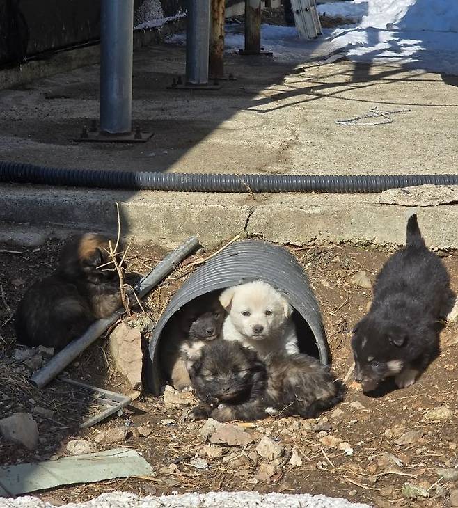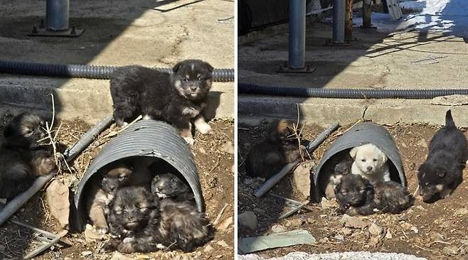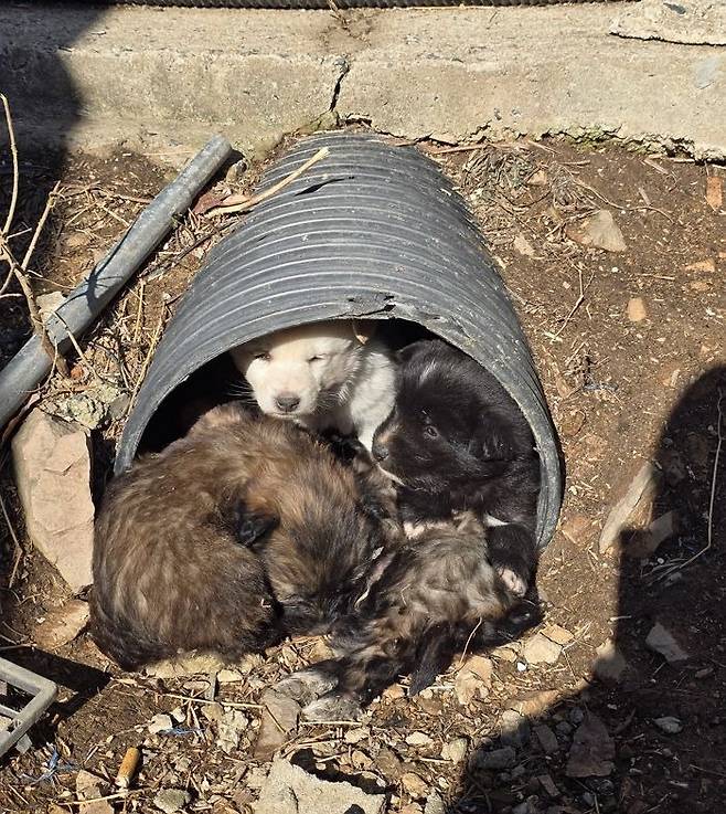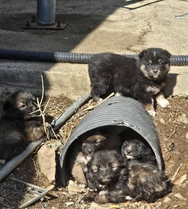 공개된 사진 속에는 낡은 파이프 관을 아지트 삼아 옹기종기 모여 있는 아기 인절미와 흑구들이 담겨 있습니다.