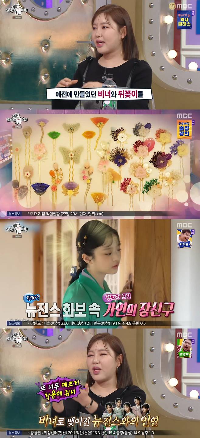 과거 무명 시절 수입이 없어 비녀를 만들었다는 송가인은 “지금은 만들지 않는다. 다만 뉴진스의 화보 이후로 드라마 쪽에서 연락이 왔다”라며 “여자주인공의 비녀가 필요하다고 했다. 비용을 물어보시는데 그냥 무상으로 해드린다고 했다”라고 전했다.