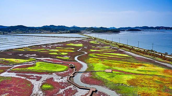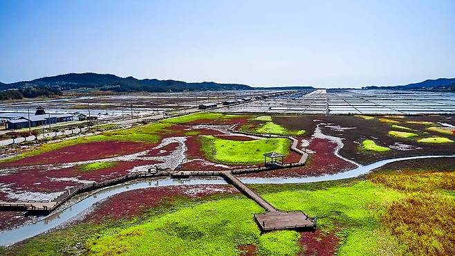 태평염전의 드넓은 평지 위에 펼쳐진 붉은 레드카펫 같은 함초 풍경은 단연 압권.