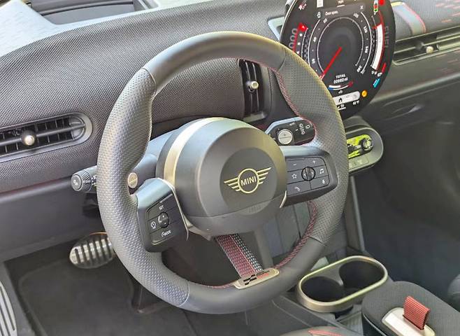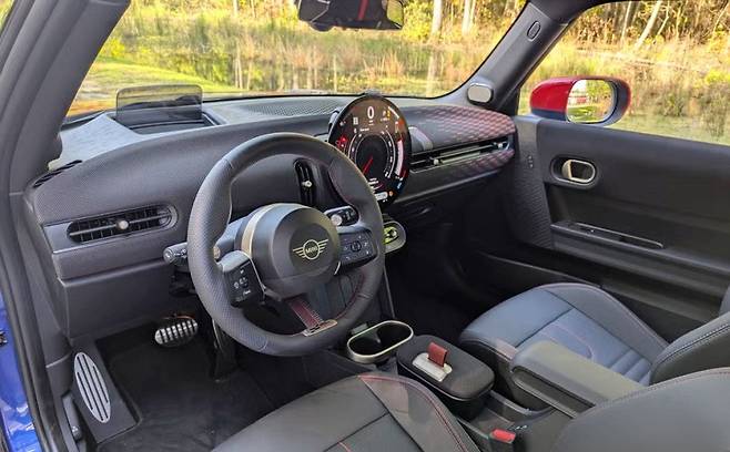 새로운 JCW는 이전 모델의 주행 감각을 그리워하면서도 최신 기술과 인포테인먼트 시스템을 원하는 사람들에게 이상적인 선택입니다. 중앙의 둥근 OLED 터치스크린은 무선 애플 카플레이와 안드로이드 오토를 지원합니다. 거의 모든 제어 기능이 새로운 디스플레이로 통합되었지만, 다행히 소프트웨어는 직관적이고 사용하기 편리합니다. 아쉬운 점은 타코미터를 스크린에서만 확인할 수 있다는 것입니다. 수동 모드에서는 기어 변속 표시기가 헤드업 디스플레이에 나타나지만, 회전수를 확인하려면 시선을 도로에서 돌려야 합니다.