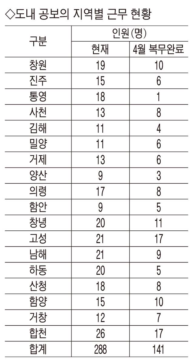 특히 도내 배치된 공보의 중 절반 정도가 이탈하는 곳은 비상이다. 합천군은 26명 중 17명, 산청군의 경우 18명 중 8명이 4월 복무를 마치는 것으로 파악됐다.