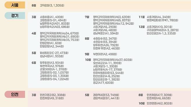 지역별로는 경기도가 2만3,800가구로 전체 물량의 대부분을 차지했으며 고양창릉·남양주왕숙 등 3기 신도시와 수원광교·평택고덕 등 2기 신도시를 중심으로 이뤄질 예정이다.