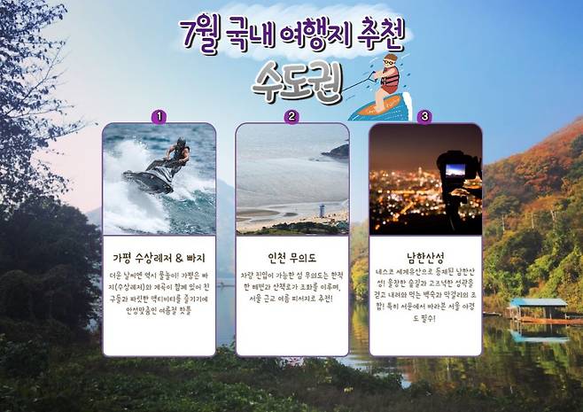 7월 하면 여름, 여름 하면 가평이란 말이 나올 정도로 가평은 수상레저의 천국이라 할 수 있어요. 또한 인천 무의도는 인천공항 아래에 있는 섬으로, 조용한 매력이 있습니다. 하나개해수욕장에서 서해의 황홀한 낙조도 바라보며 맛있는 해산물도 맛보세요.