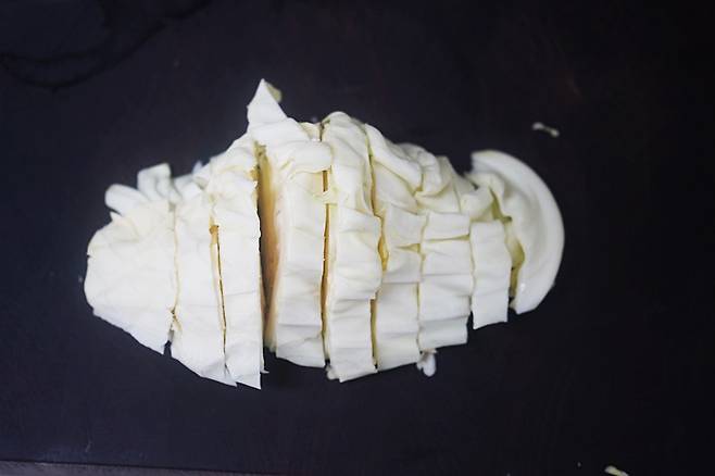 길쭉하게 썰어야 양념이 잘 배고 식감도 좋더라고요.