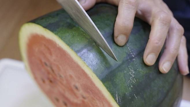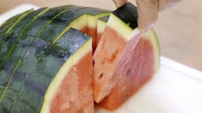 마지막 방법은 바로 많은 손님이 왔을 때인데요. 반으로 자른 수박을 먼저 도마에 두세요. 그리고 일정한 간격으로 쭉쭉 잘라 줍니다. 이때 주의할 점은 끝 부분은 흰 과육으로 너무 두껍게 자르지 않는 것이 좋아요.