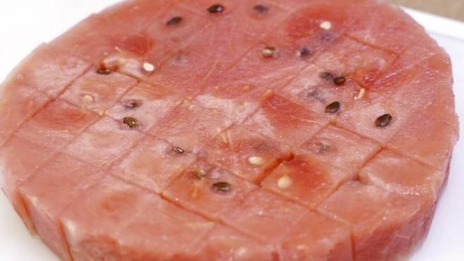 이렇게 자른 후 도마에 수박을 붓게 되면 이렇게 일정한 간격으로 사각 썰기가 된 것을 보실 수 있어요.
