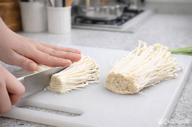 먼저 팽이버섯을 손질한다. 팽이버섯 밑동의 지저분한 끝부분만 살짝 잘라낸다. 밑동이 붙어 있어야 조리할 때 모양이 흐트러지지 않는다. 버섯은 옆으로 뉘어 4등분으로 두툼하게 저며준다. 쪽파는 잘게 썰어둔다.