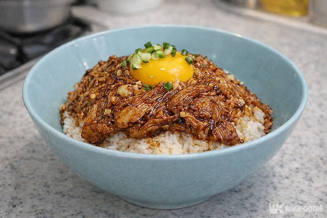 그릇에 밥을 담고 그 위에 소스에 졸여진 버섯을 가지런히 올린다. 가운데에 노른자를 얹고 쪽파를 뿌려 마무리한다. 노른자를 톡 터뜨려 밥과 함께 먹으면 깊은 풍미를 느낄 수 있다.