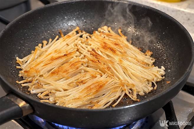 3. 팬에 기름을 두르고 강한 불에서 버섯을 튀기듯 앞뒤로 굽는다.