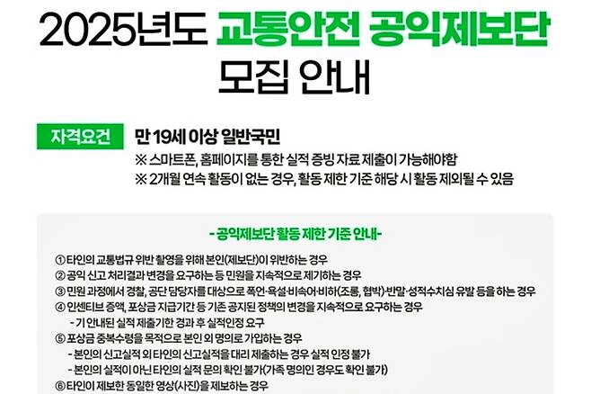 한국교통안전공단에서 교통안전 공익제보단을 모집한다. 2025년 3월 14일에 1차, 3월 21일에 2차 모집 예정이다. 모집인원은 일반 국민 5,000명에 추가로 TS 배달 이륜차 라이더 양성 교육 이수자 500명을 선발한다. 이후에도 월 1회 선별 과정을 진행한다는 계획이다. 만 19세 이상 대한민국 국민 누구나 신청할 수 있다. 신청 인원이 초과할 시, 조기 마감의 가능성도 있다.