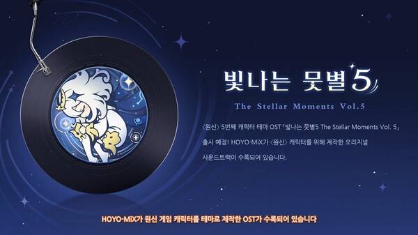 원신의 5번째 캐릭터 테마 OST가 출시 예정이다. 해당 OST에는 아를레키노, 시그윈, 한운, 키니치의 테마곡이 수록되어 있다.