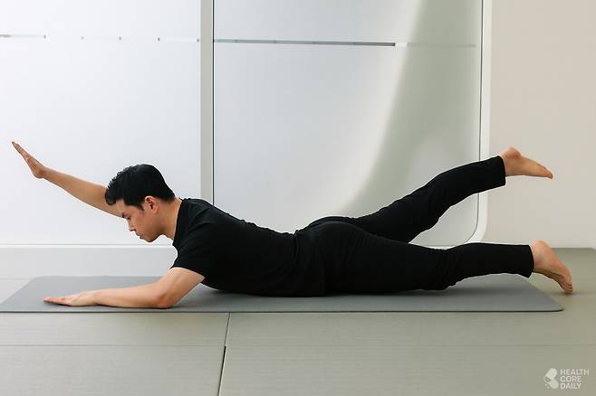 매트 위에 배를 대고 엎드린다. 팔은 머리 위로 쭉 뻗고, 다리는 자연스럽게 벌려준다. 왼팔과 오른다리를 동시에 들어 올렸다가 천천히 내린다. 이번엔 오른팔과 왼다리를 들어 올린다. 이 동작을 교차로 반복하면서 1분 동안 진행한다.