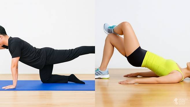바닥에 매트를 깔고 네 발로 기는 자세를 만든다. 손은 어깨 아래, 무릎은 엉덩이 아래에 오도록 맞춘다. 복부에 힘을 주면서 왼팔은 앞으로, 오른다리는 뒤로 쭉 뻗는다. 2초 정도 버틴 후 다시 원위치. 반대쪽 팔과 다리도 같은 방식으로 반복한다. 1분 동안 교차하며 진행한다.